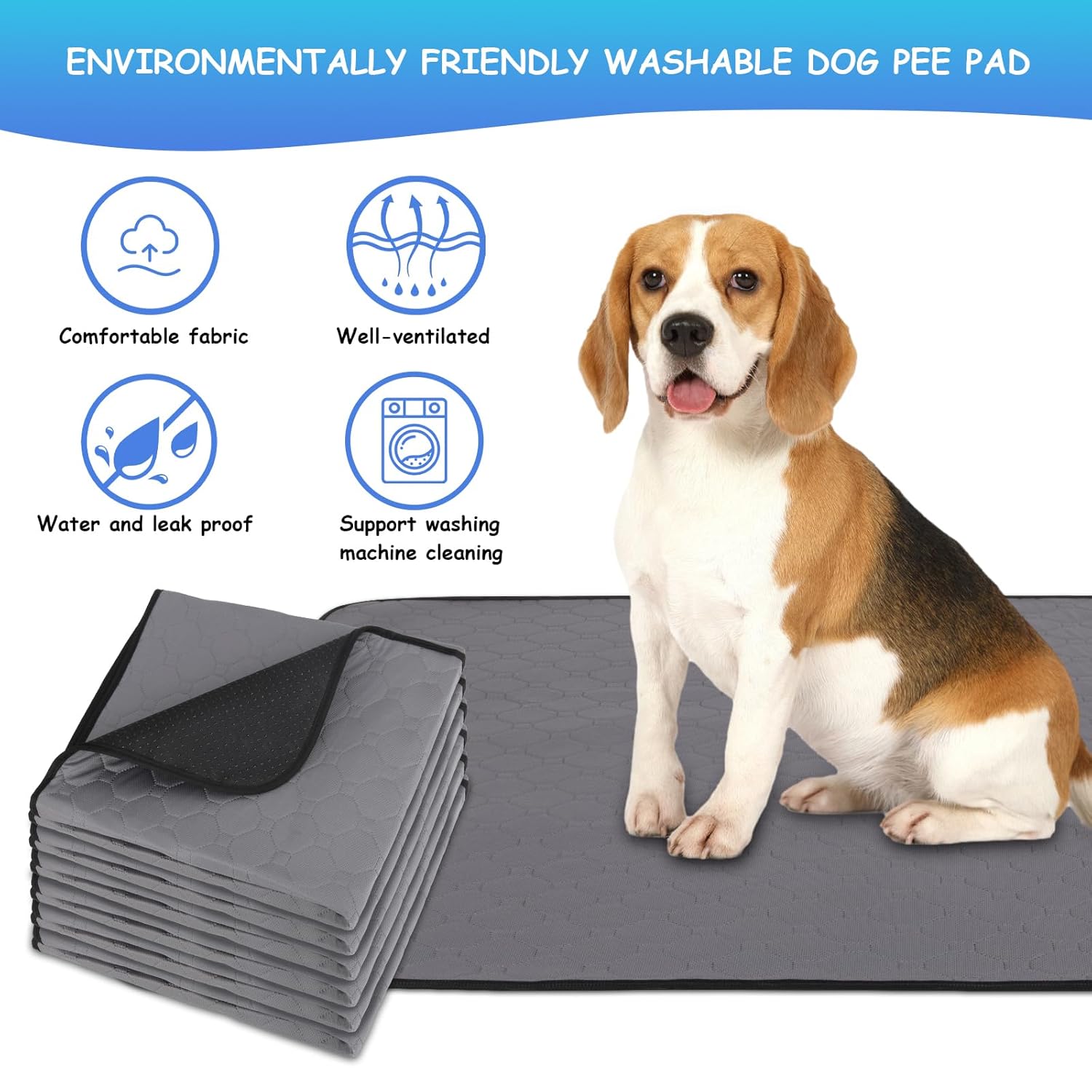 🐶WATERPROOF MATERIAL: Our reusable and washable pet pee pads are made with 4 layers of protection, including a waterproof inner layer, highly absorbent polyester, and a non-slip bottom layer. The first smooth and breathable surface layer ensures ultimate comfort for your pets, while liquids are prevented from seeping through the middle layer.The breathable waterproof material on the third layer adds to the durability of the pad.