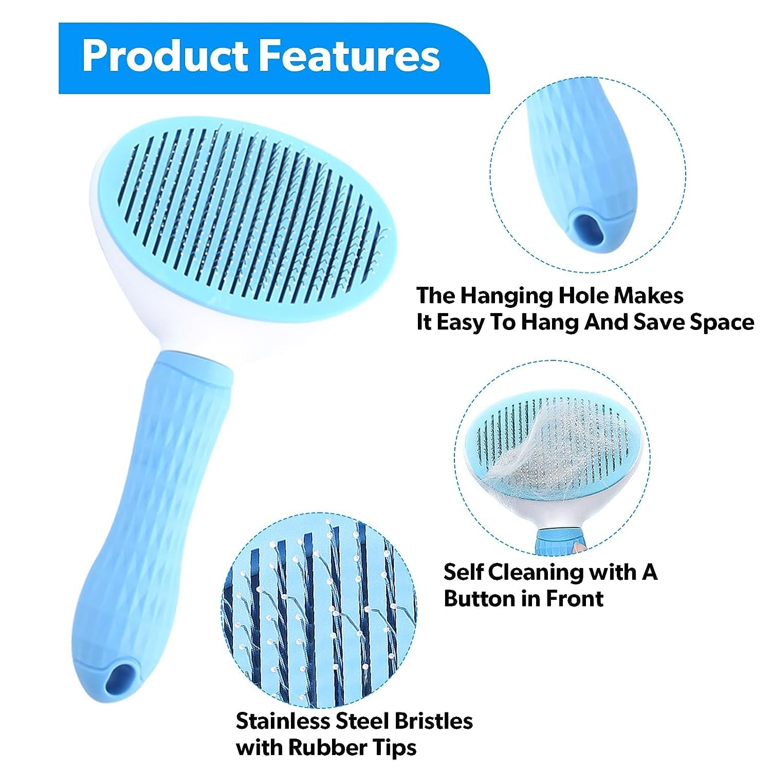 Dogs Grooming Brushesx1 (blue) + Bathing BrushSize: 7.4″ x 4.1″ ( length x width )brush pin length: 0.4″ handle length: 5.2″Pros: Regarding this dog brush, it has massage particles that can better promote the blood circulation of pets. With the click of a button, and then retracting the mane, it is very easy to remove all hair from the brush and clean
