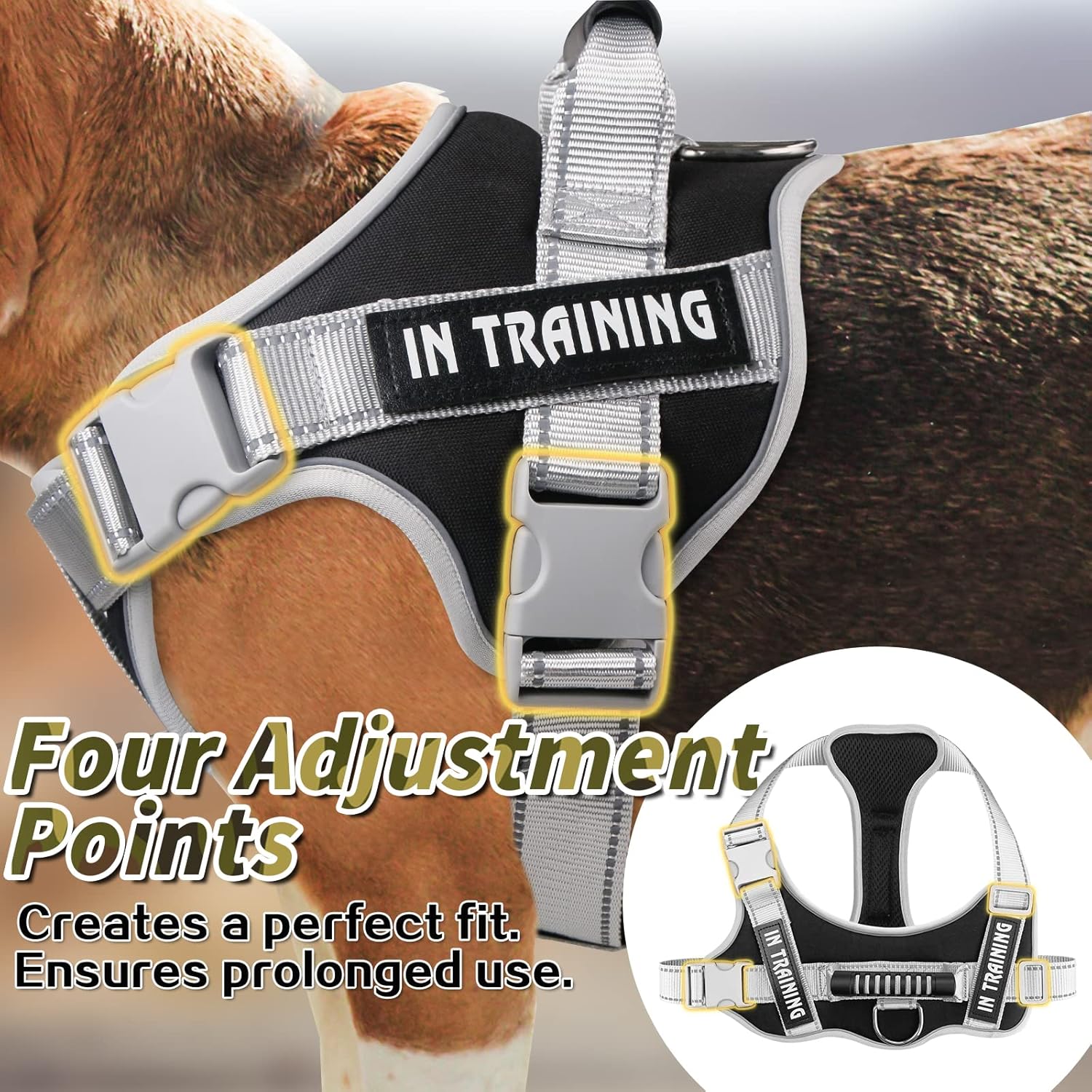EASY ADJUSTABLE:4 ways adjustable straps, gets a customized fit with room for growth. Lightweight and durable, designed with minimum bulk for maximum dexterity.2 quick release buckles for easy on and off while providing extra security,Dog Harness with a Top handle for traffic control.