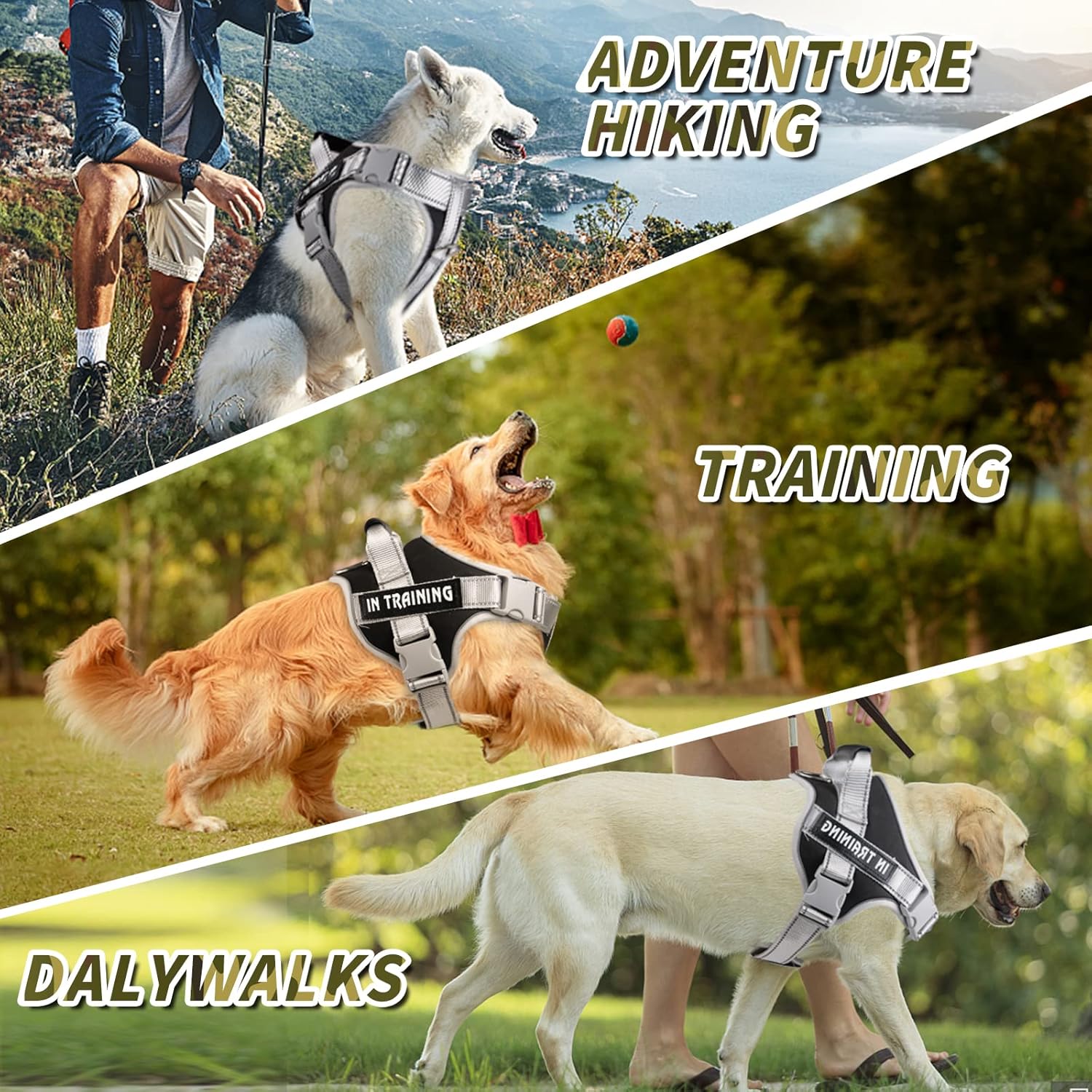 PVC REFLECTIVE WEBBING:Dog Harness comes with PVC reflective sewn strips, PVC reflective webbing has excellent night visibility,Reflective straps to ensure your dog is highly visible and keep dogs safe at night.
