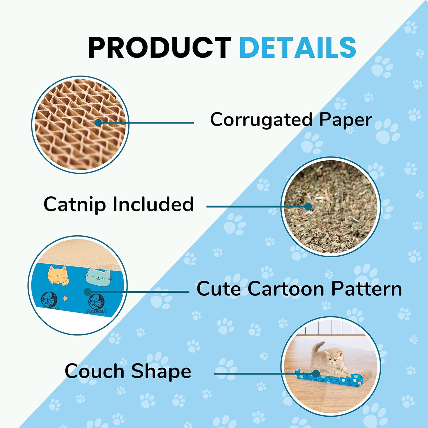 【SPECIAL & DURABLE DESIGN】The couch-designed scratching pad makes for easier scratching to contour a cat’s ability to flex and stretch its body. It is also perfect for claw well-maintenance, exercise & muscle toning. Could be used on either side, making it even longer lasting.