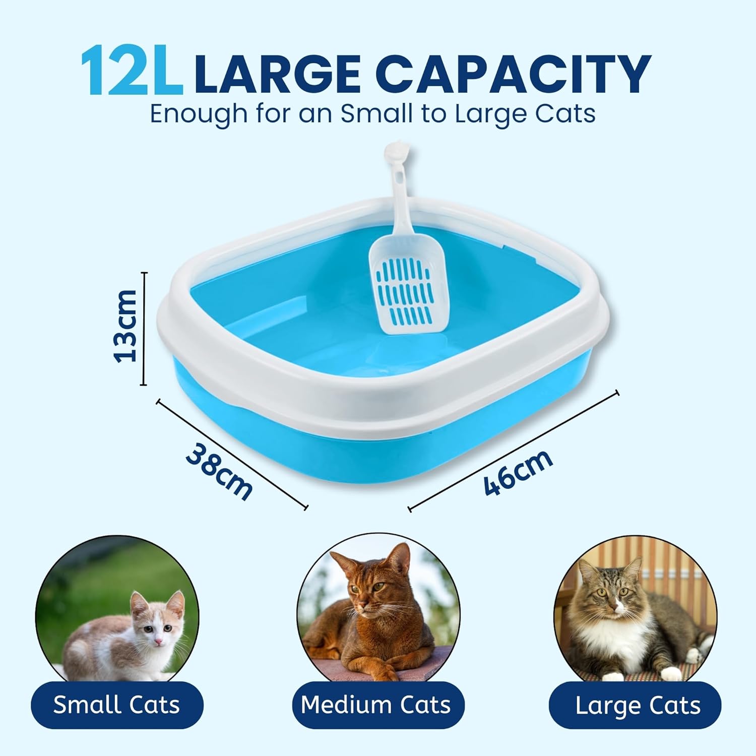 Reduces messy litter box scatter. Simply fill colored pan half way. It’s compatible with all types of kitty litter. Durable, thick non-stick plastic – keeps litter from sticking. Easy to clean. Modernly designed cat litter tray with removable rim. The litter tray has a low entry height for easy access. The rim stops litter from flying around and helps keep the surrounding area clean and tidy. With the help of our cat litter scoops micro or macro you can easily scoop out waste. Product Size: 46 x 37 x 12 cm.