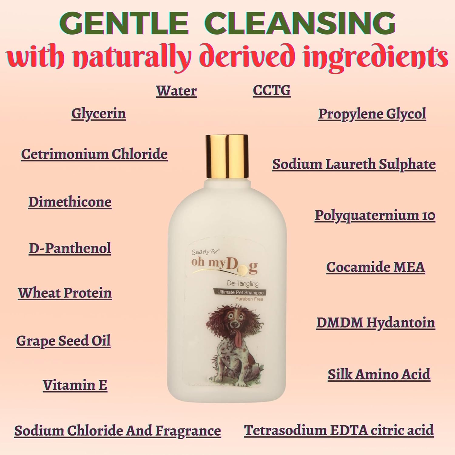 【Detangling Shampoo】Oh My Dog Detangling Shampoo is formulated to make your pet’s coat silky and more manageable. Grape seed oil, wheat protein, and silk amino acid help to add lustre and strengthen damaged coats.