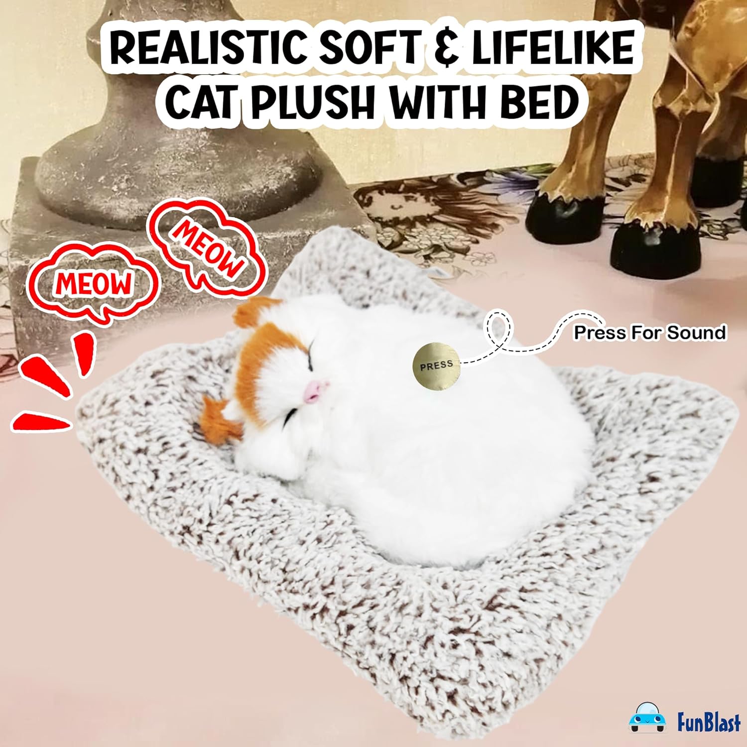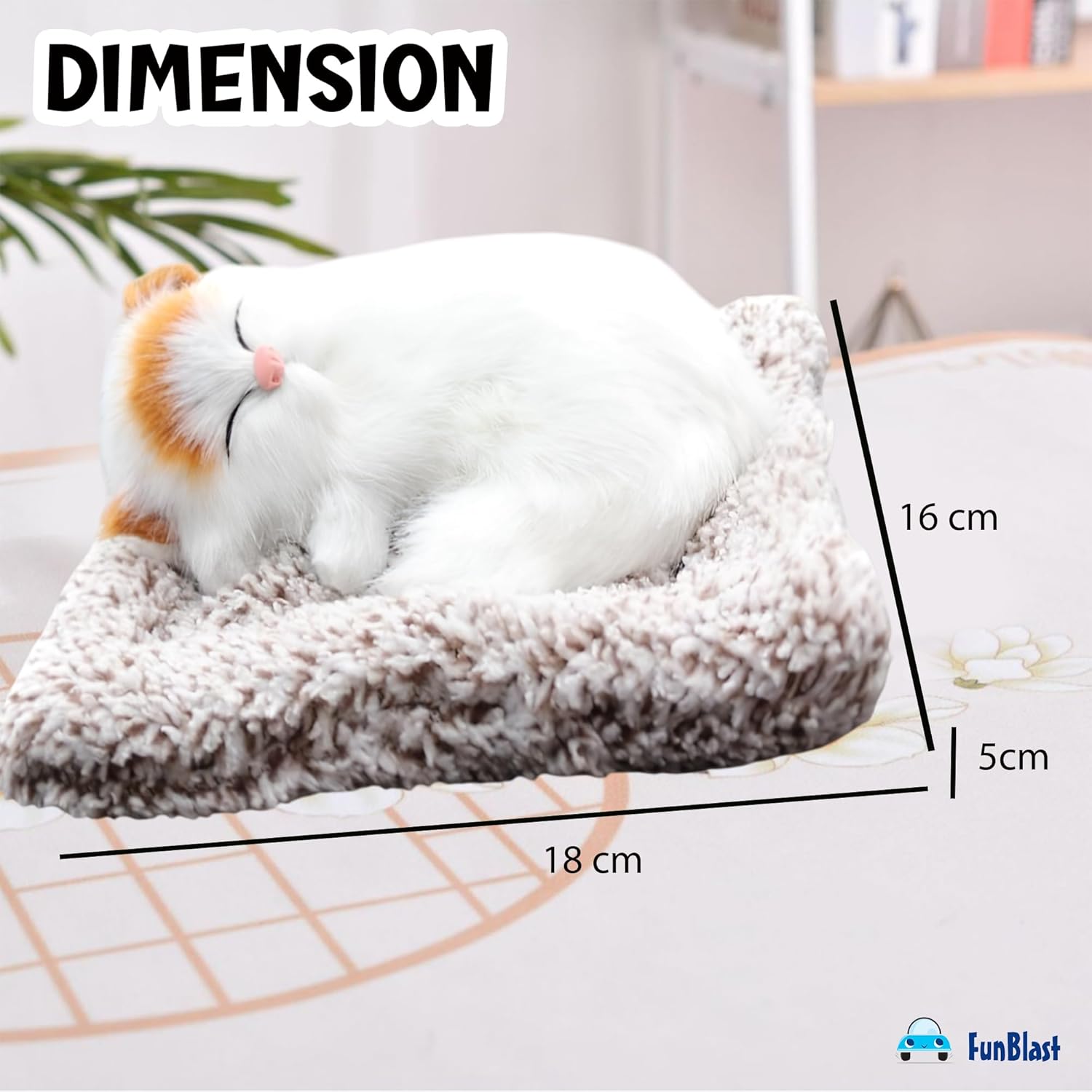 FunBlast Cute Sleeping Cat Plush Toy with Meow Sound, Gift for Kids, Toy Accessories for Car Dashboard Realistic & Adorable Design – This sleeping cat plush features lifelike fur texture and vibrant markings, making it look just like a real kitten napping peacefully. Product Dimension – (Please refer to images for exact dimension) Soft & Cuddly – Made with ultra-soft, high-quality materials, this plush cat is perfect for snuggling and petting, providing comfort and warmth Perfect Home Decor – A charming decorative piece for your home, office, or car, adding a cozy and heartwarming touch to any space No Maintenance Pet – Enjoy the companionship of a cute sleeping cat without the hassle of feeding, grooming, or cleaning up after a real pet Great Gift Idea – A wonderful gift for cat lovers, children, seniors, and anyone who appreciates cute and cozy plush toys