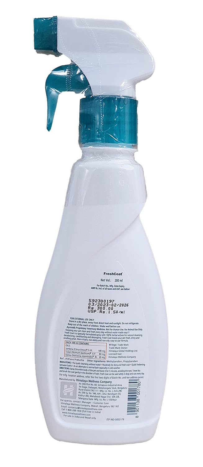 Himalaya FreshCoat No-rinse Spray is a convenient solution to keep your pets clean and fresh without the need for a traditional bath.