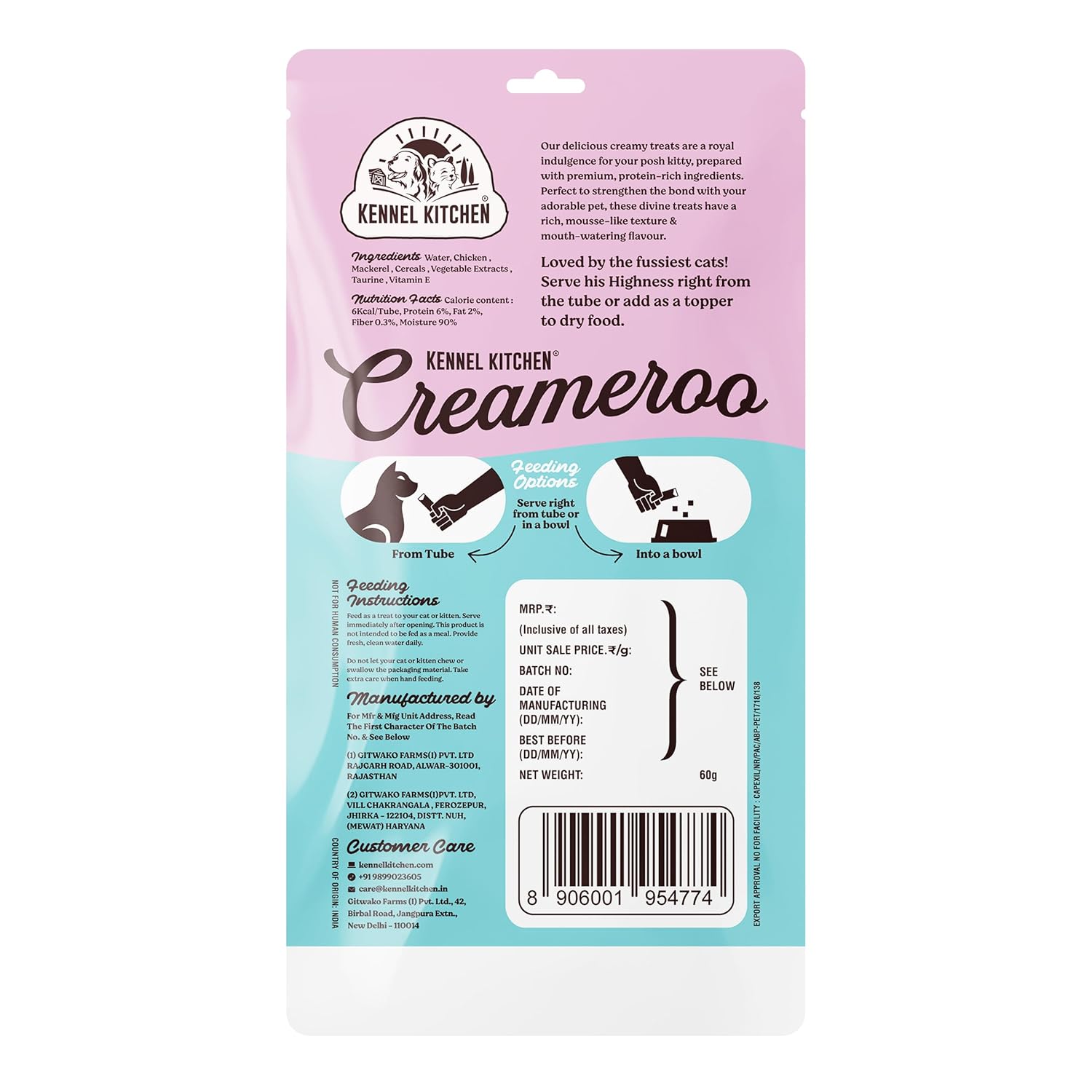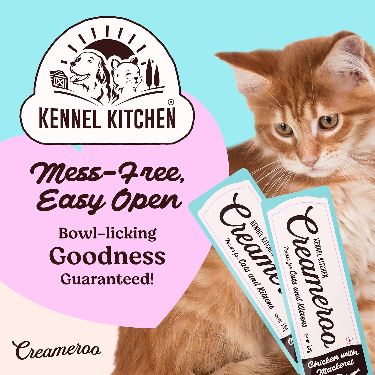 Loved by the fussiest cats. Kennel Kitchen Creameroo creamy treat for cats are a royal indulgence for your posh kitty. Serve his highness right from the tube or add as a topper to dry cat food.