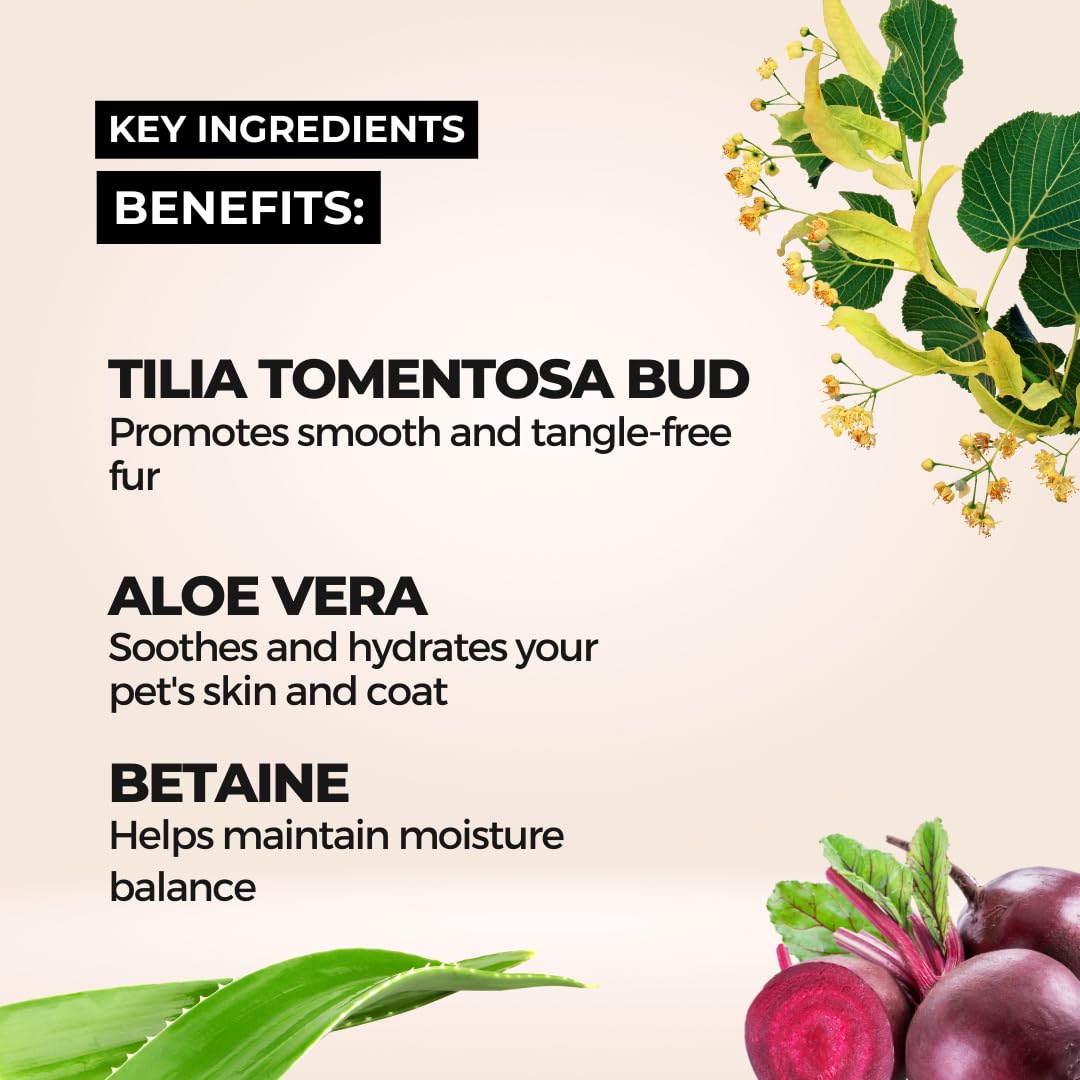 Natural Freshness: Enriched with Tilia Tomentosa Bud Extract and Aloe Vera, our spray works as both a detangler and a dog odour remover. It leaves your furry friend smelling fresh and clean, making it the perfect pet odour eliminator