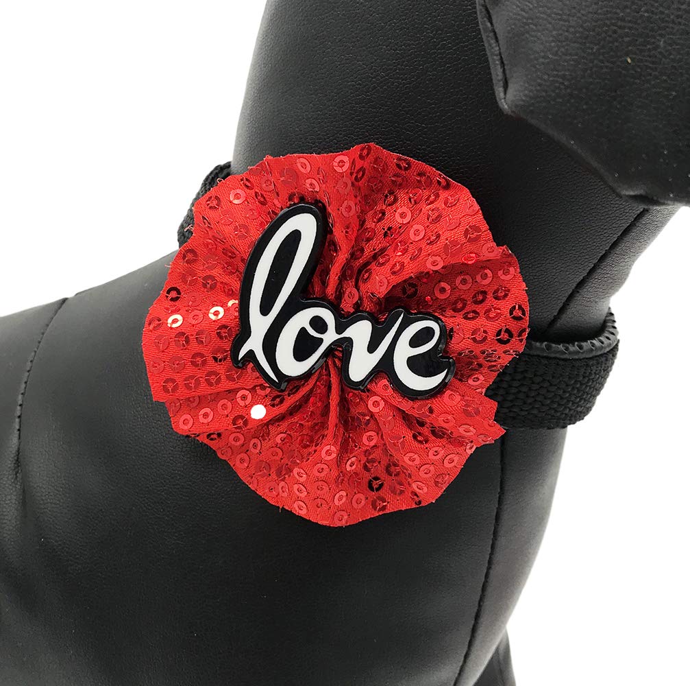 The flowers size about 3.4”.The back of the flower has a stretchy elastic rubber band that can be decorated with a lot of size collars and you can remove it to any position of the collar,also easy to put on or take off.