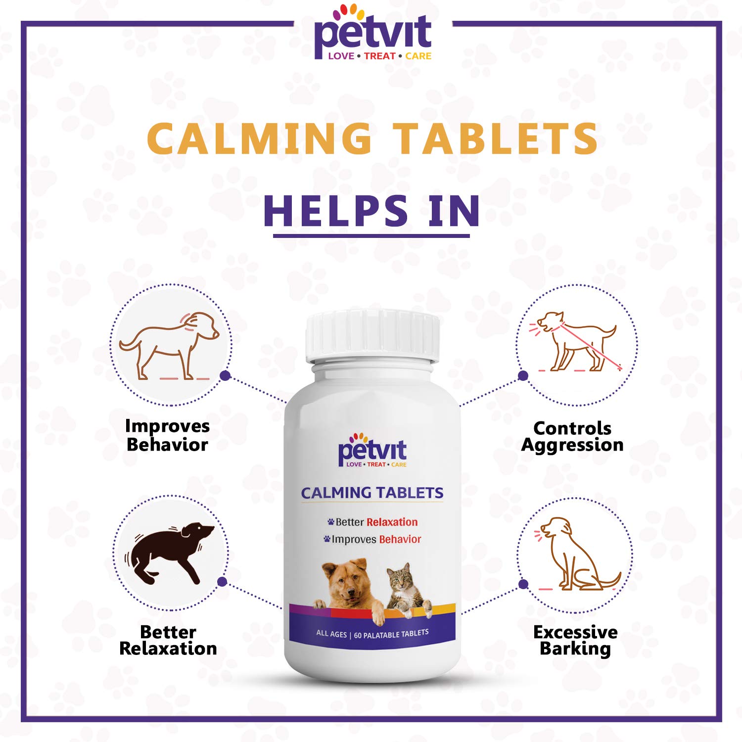 Petvit Calming tablets helps in Travelling stress, Motion sickness, Stress induced behavioural problems (during fireworks, excessive barking and aggression) Grooming stress. Petvit Calming tablets contain Chamomile proven stress reliever that promotes general relaxation,better relaxation,Improves behaviour,helps to calm in Nature.
