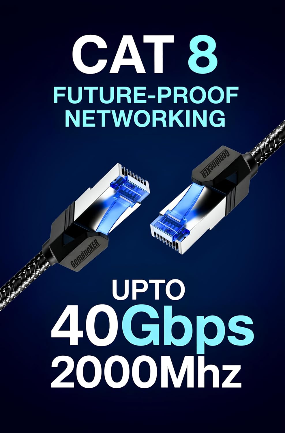Blazing 40Gbps Speed & 2000MHz Bandwidth: The GenuineXER Cat 8 LAN Cable delivers ultra-fast data transfer up to 40Gbps with 2000MHz bandwidth—perfect for 4K streaming, gaming, and heavy file transfers. Enjoy ultra-low latency and rock-solid stability for high-performance smart homes and office networks.