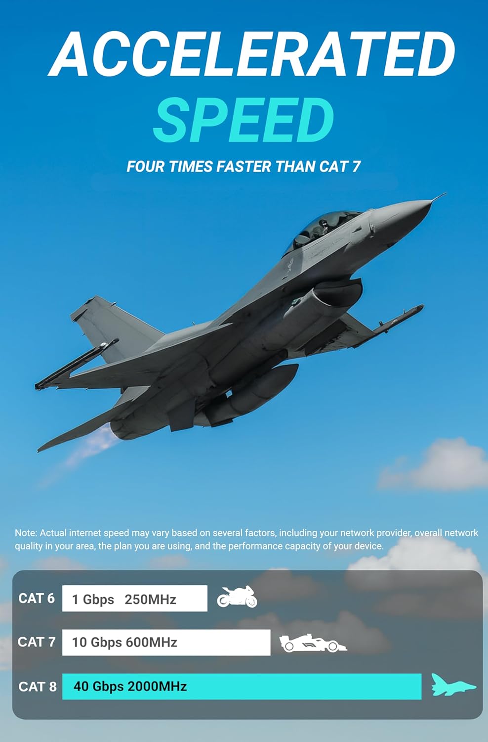 Unmatched Speed: With up to 40 Gbps speed, GenuineXER Cat 8 ensures lag-free gaming, far outperforming Cat 5 (100 Mbps), Cat 6 (1 Gbps), and Cat 7 (10 Gbps).Low Latency: Its high frequency of 2000 MHz reduces latency, delivering real-time responsiveness critical for competitive gaming.Stable Connection: Double shielding minimizes electromagnetic interference (EMI), providing a more stable and consistent connection than older cables.Future-Proofing: Cat 8 supports ultra-high-speed internet plans and next-gen gaming consoles, ensuring compatibility with upcoming technologies.Durability: The nylon-braided, double-shielded design of GenuineXER Cat 8 withstands wear and tear, ideal for frequent setups or gaming rigs.Enhanced Streaming: Perfect for 4K/8K game streaming, Cat 8 handles high bandwidth demands without buffering or dropped frames.Short-Distance Performance: Cat 8 maintains peak performance over shorter distances, ideal for gaming setups where stability matters most.Ultimate Gaming Edge: GenuineXER Cat 8 provides faster, more reliable, and interference-free gaming compared to Cat 5, Cat 6, or Cat 7.