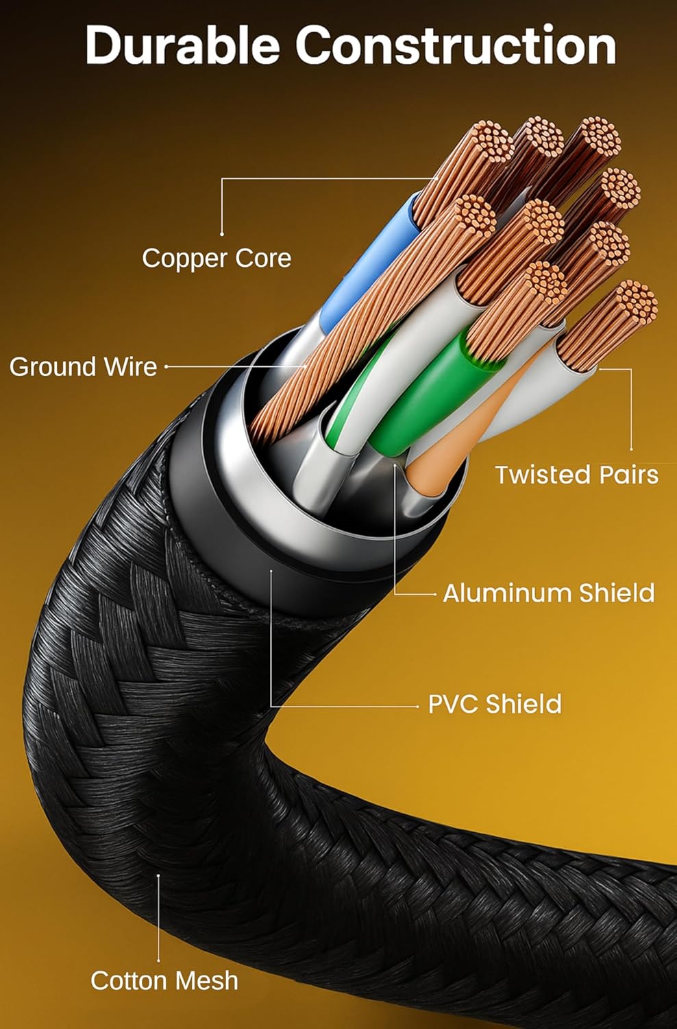 Durable Design: GenuineXER cat 8 lan cable is nylon-braided, double-shielded combines durability with superior signal quality. The nylon/cotton braiding resists wear, tangling, and stretching, making it ideal for frequent handling and tight spaces. Double shielding protects against electromagnetic and radio frequency interference (emi/rfi), ensuring a stable and fast connection even in high-interference environments.