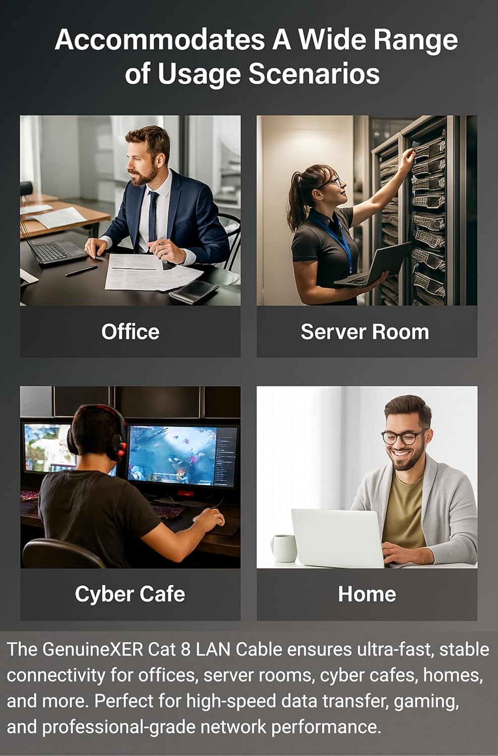 Wide Compatibility Across Devices: The GenuineXER cat 8 lan cable is widely compatible with a range of devices, including routers, switches, gaming consoles, pcs, and smart tvs. this versatility makes it an essential addition to any home or office network setup. no matter your networking needs, this cable delivers performance and reliability across all your devices.