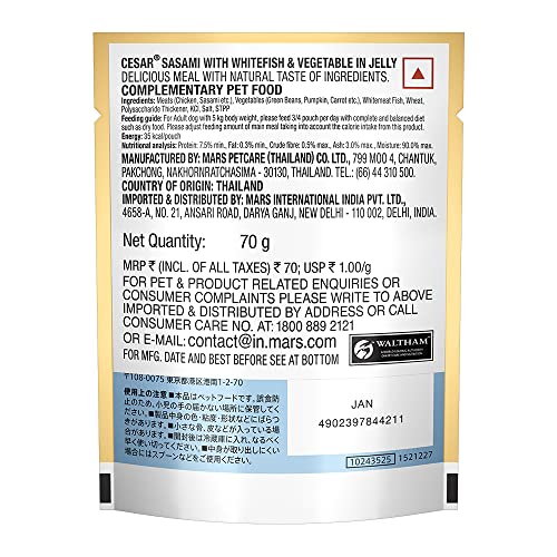 Specification: Cesar Adult Wet Dog Food, Sasami with Whitefish & Vegetables in Jelly, 70gm, Pack of 16