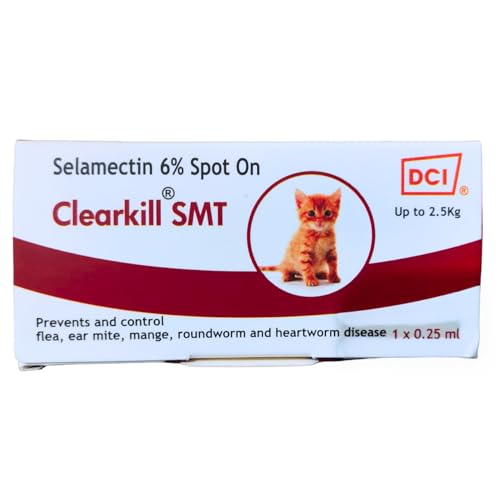 Specification: Clearkill SMT Selamectin 6% Flea Spot on 0.25 ml, Treatment of Ear mite, Mange, Roundworm and heartworm for Kittens & Cats up to 2.5 kg