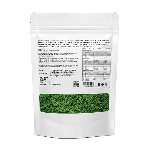 Specification: Congo 100gm Moringa Powder to Provide Essential Proteins for Budgies, Lovebirds, Cockatiels, Conure, Senegal, Amazon, African Grey, Macaw, Cockatoo and Other Birds, 100gm