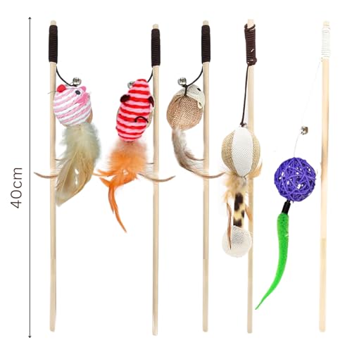 {VARIETY PACK}: Includes 5 different teaser sticks Ball teaser, Mouse Bell Teaser, Round Rat Teaser Stick, Ball Bell and Sisal Mouse teasing toys, each toy in the set features unique, cute shapes to keep your cat interested and engaged.