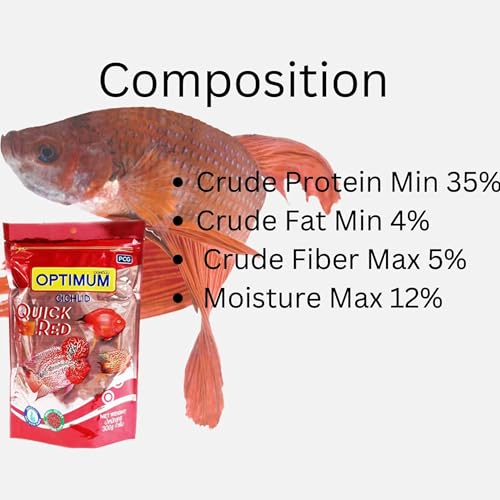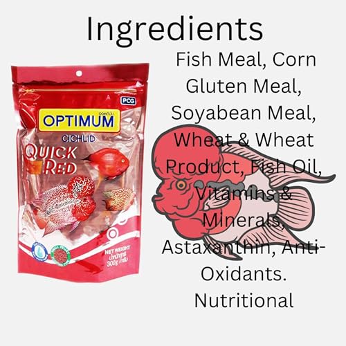 Optimum Cichlid Quick Red Small Pellet Fish Food,300G, Ingredients: Fish Meal, Corn Gluten Meal, Soybean Meal, Wheat and Wheat Product, Fish Oil, Vitamins and Minerals, Astaxanthin, Food Coloring, Antioxidants Product Details:1. Optimum Cichlid Quick Red Food 300g2. Optimum cichlid fish food enhances body color food.Features:Optimum Quick Red Cichlid Food is a complete and balanced feed that helps in bringing out the natural beauty and proper body shape of the fishes. It gives rapid color enunciation and the small size pellets do not cloud the water. The carefully chosen ingredients do not pollute the aquarium. Complete and Balance in addition to being fortified with astaxanthin to color-enhance your fish It contains Astaxanthin, a carotenoid pigment that enhances the brilliant natural color of aquarium fish Rich in Vitamin-C * Vitamin-E to help reduce stress and increase immunity. It is complete and balances in addition to being fortified with astaxanthin to color-enhance your fish. It contains Astaxanthin, a carotenoid pigment that enhances the brilliant natural color of aquarium fish. Rich in Vitamin-C * Vitamin-E to help reduce stress and increase immunity. Ingredients: Fish Meal, Corn Gluten Meal, Soyabean Meal, Wheat and Wheat Product, Fish Oil, Vitamins and Minerals, Astaxanthin, Anti-Oxidants. Nutritional Feeding Instruction: Feed 2-3 times daily. Sprinkle just enough food that the fish can consume within 15 minutes, Do not overfeed because unconsumed food will reduce overall water quality (to the detriment of your fish).
