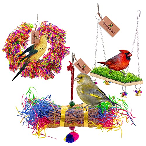 GREENBIRDS TOYS Pack Of 3 Pcs Include Paper Shredded Foraging Chew Toy, Grass Swing, Cage Hanging Accessories Birds Toys Natural Wood Parrot Toys Cage Accessories Training Aid, Perch For Bird & Parrot