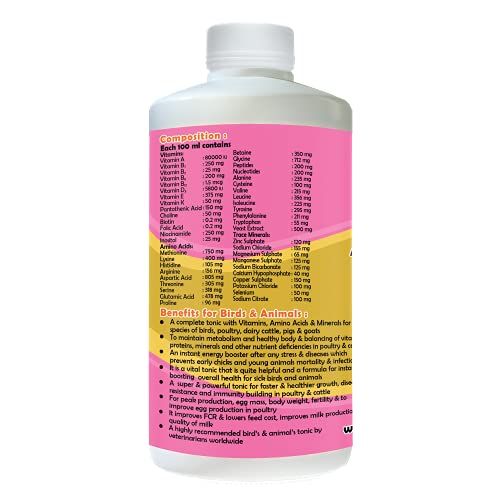 Compositions of Amino Power:Each 100 ml contains Vitamins: Vitamin A: 80000 IU Vitamin B1 : 250 mg Vitamin B2 : 25 mg Vitamin B6 : 200 mg Vitamin B12 : 1.5 mcg Vitamin D3 : 5800 IU Vitamin E: 375 mg Vitamin K: 50 mg Pantothenic Acid: 150 mg Choline: 50 mg Biotin: 0.2 mg Folic Acid: 0.2 mg Niacinamide: 250 Mg Inositol:25 mg Amino Acids: Methionine :750 mg Lysine :400 mg Histidine : 105 mg Arginine :156 mg Aspartic Acid :805 mg Compositions of Amino Power : Each 100 ml contains Threonine : 305 mg Serine : 318 mg Glutamic Acid : 478 mg Proline : 96 mg Betaine : 350 mg Glycine : 712 mg Peptides : 200 mg Nucleotides : 200 mg Alanine : 235 mg Cysteine : 100 mg Valine : 215 mg Leucine : 356 mg Isoleucine : 225 mg Tyrosine : 295 mg Phenylalanine : 211 mg Tryptophan : 55 mg Zinc Sulphate : 120 mg Yeast Extract : 500 mg Trace Minerals: Sodium Chloride : 155 mg Magnesium Sulphate : 65 mg Manganese Sulphate : 125 mg Sodium Bicarbonate : 125 mg Calcium Hypophosphate : 40 mg Copper Sulphate : 150 mg Potassium Chloride : 100 mg Selenium : 50 mg Sodium Citrate : 100 mg Dosage of Amino Power: Pig and Swine: 10 ml. morning and 10 ml. Evening. Small Animals: 5 ml in the morning and 5 ml in the evening Pet Birds: 5 ml. with 200 ml of water or soak with food Pigeon: 10 ml. with 500 ml of water or soak with 500 gm of feed.