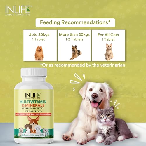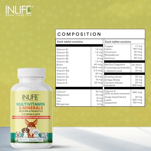 INLIFE Multivitamin for Dog Cat & Pets | Ginseng, Prebiotic & Probiotic Vitamin B12, C, D, E, Zinc & Biotin Supplement for Healthy Growth, Skin & Coat, Immune Support Supplement – 60 Tablets