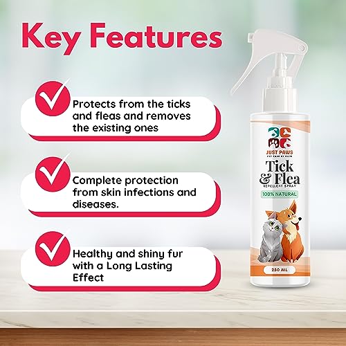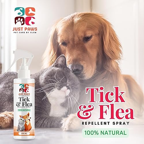 JUST Paws PET Care Just Paws Tick & Flea Repellent Spray for All Pets 250 ML | Ticks & Fleas Remover for Dogs|100% Natural|Safe for All Pets|Cat Tick & Flea Repellent Spray|Dog Ticks Remover Spray