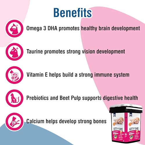 Kitty Yums is a unique kitten food recipe formulated with high quality ocean fish, such as sardines and mackerel. This meal with more meat and less grain provides your cats with higher level of protein for stronger, bones and muscles. Enriched with omega fatty acids, taurine, prebiotics, probiotics and calcium supports the complete growing needs and overall vital system of your kitten. With no soy, corn or wheat, it is a complete and balanced meal to nourish your pet kitten.