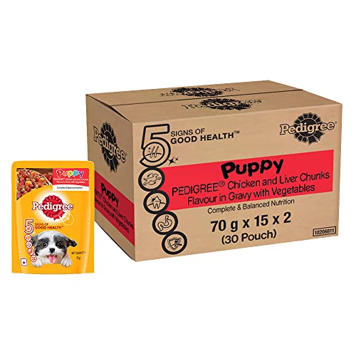 Specification: Pedigree Puppy Wet Dog Food, Chicken and Liver Chunks Flavour in Gravy with Vegetables, 70 g (Pack of 30), Complete & Balanced Nutrition for Puppies