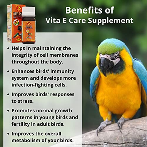 Vita E-Care – Supplement to ensure pet bird receives required Vitamin E. Helps in maintaining the integrity of cell membranes of the body. Enhances birds’ immunity system and metabolism. Improves birds’ responses to stress. Promotes normal growth patterns in young birds and fertility in adult birds.