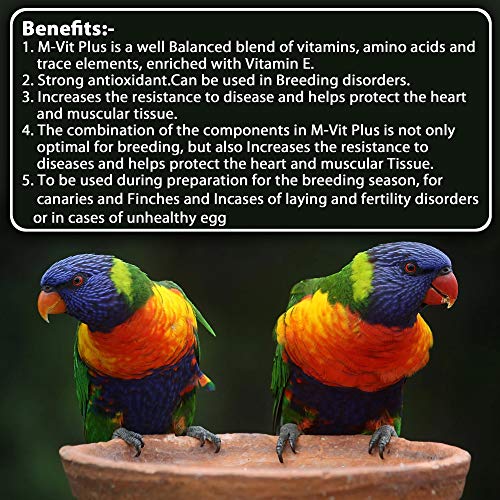 M-Vit Plus is a well Balanced blend of vitamins, amino acids and trace elements, enriched with Vitamin E. To be used during preparation for the breeding season, for canaries and Finches and Incases of laying and fertility disorders or in cases of unhealthy egg. M-Vit Plus promotes healthy breeding. During the Breeding season a bird needs as optimal blend of vitamins, amino acids ad trace elements. The essential Vitamin E, also, called as Fertility Vitamin, is a strong anti-oxidant. The combination of the components in M-Vit Plus is not only optimal for breeding, but also Increases the resistance to diseases and helps protect the heart and muscular Tissue.