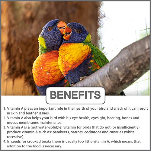 Vitamin A also helps your bird with his eye health, eyesight, hearing, bones and mucus membranes maintenance.
