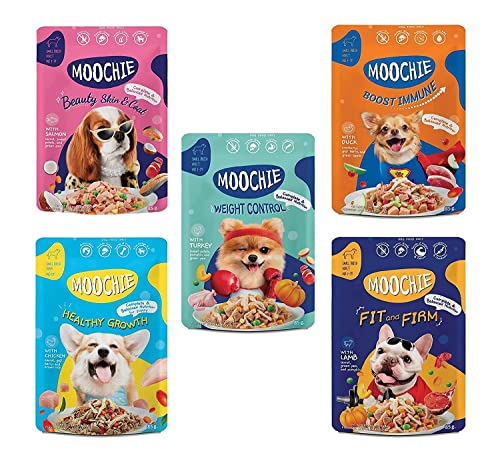 MADE WITH QUALITY INGREDIENTS: Indulge your dog with Moochie Wet Dog Food, which is made with high-quality ingredients to provide a nutritious and tasty meal. Each recipe is carefully designed to meet your dog’s dietary requirements, ensuring the best possible nutrition. The 6 Irresistible flavours include Beauty Skin & Coat, Weight Control, Healthy Growth, Fit & Firm, Boosts Immune and Digestive care.