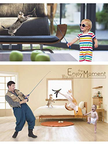 Safe material! – The fishing pole is carefully crafted from lightweight but sturdy carbon fiber with a soft foam handle which is an ergonomics grip for you to hold. Wild feather dangler is connected via long lasting nylon wire to make play more interesting.