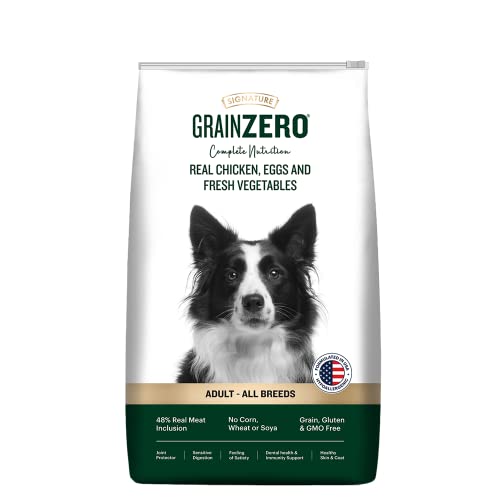 Formulated by veterinarians and nutritionists in the U.S.A, Signatures Grain Zero hypoallergenic Adult Dry Kibble is complete nutrition created to meet the needs of all adult dogs of all breeds. Made with high protein deboned chicken, eggs and fresh vegetables, this dog kibble helps develop and maintain strong muscles. The formula is grain, gluten and GMO free. The ingredients work together to provide essential protein and carbohydrates that meet your dogs energy requirements to live a healthy lifestyle. A good balance of Omega 3 and 6 fatty acids promotes a shiny coat and healthy skin. Adequate vitamins, chelated minerals and vital antioxidants support the immune system while the precise blend of calcium phosphorus and essential vitamins promotes strong bones and teeth! Ingredients and Benefits: Protein and carbohydrates to meet your dogs energy requirements Protein-rich chicken and eggs for muscle growth Omega 3 and 6 for a shiny coat and healthy skin Vitamins, minerals and antioxidants support immune system Calcium phosphorus and vitamins promote strong bones and teeth Nutritional Analysis: Protein 28%, Crude Fat 16%, Ash 6.6%, Moisture (max) 10%, Crude Fibre 2.5%, Calcium (min) 1.3%, Phosphorus (min) 1%
