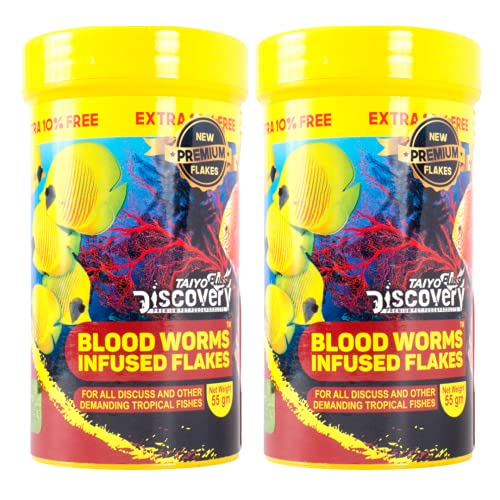 Specification: Taiyo Pluss Discovery Premium Blood Worms Infused Flakes Fish Food, 55G (50 G + Extra 10% Free) (Pack of 2) All Life Stages