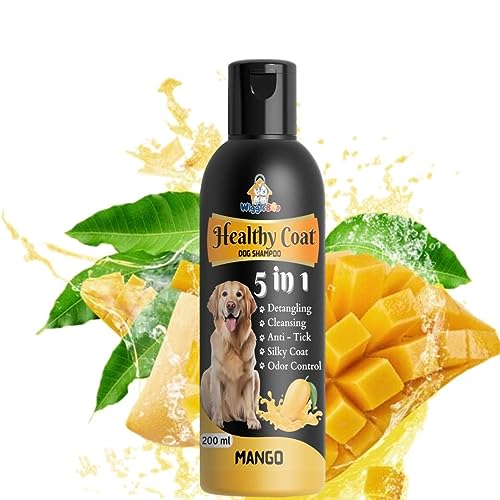 WiggleBoo 5-in-1 Healthy Coat Dog Shampoo for Detangling, Cleansing, Anti-Tick, Silky Coat, Odor Control | Dog & Puppy-Friendly | Made in India | Dog Care| Pet Grooming | Mango Fragrance (200ml)