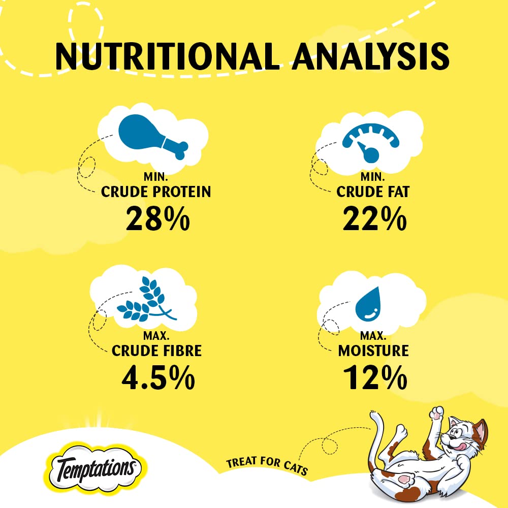 Unique pocket shape treat for cats with tasty chicken flavour that your cat will love;Come in a stay-fresh pack to keep your cat treats fresh; Also try Temptations Savoury Salmon, Seafood Medley and Tempting Tuna flavours