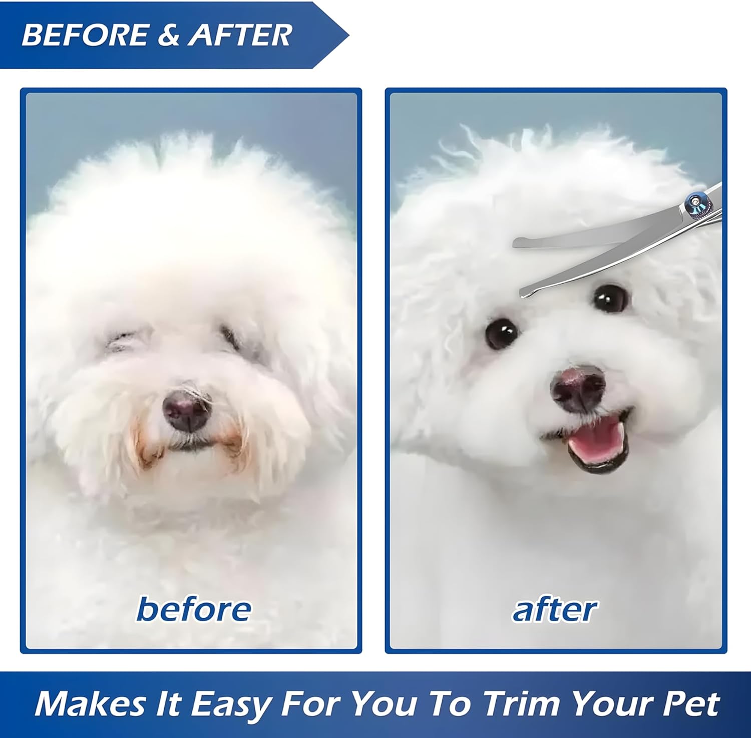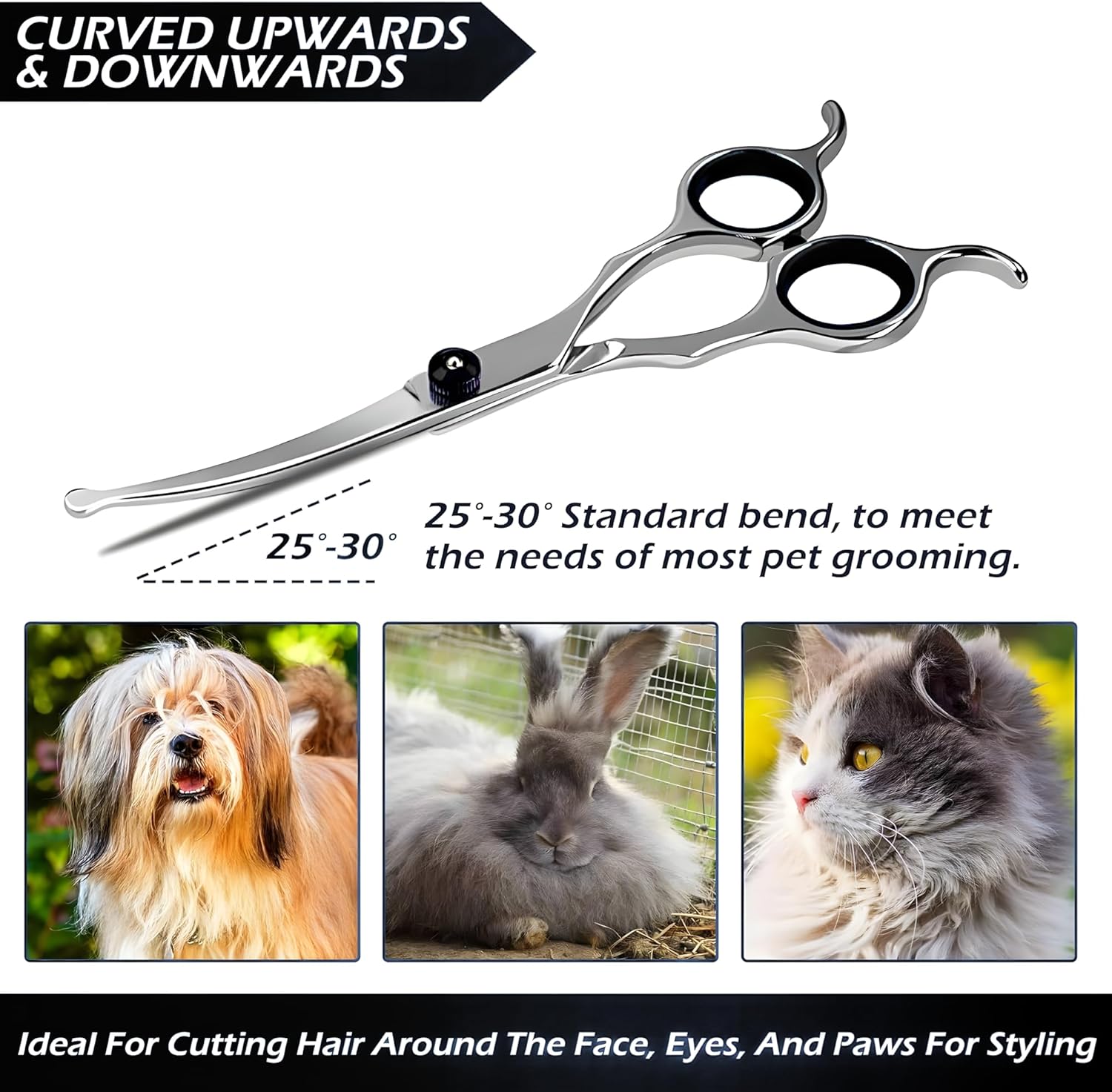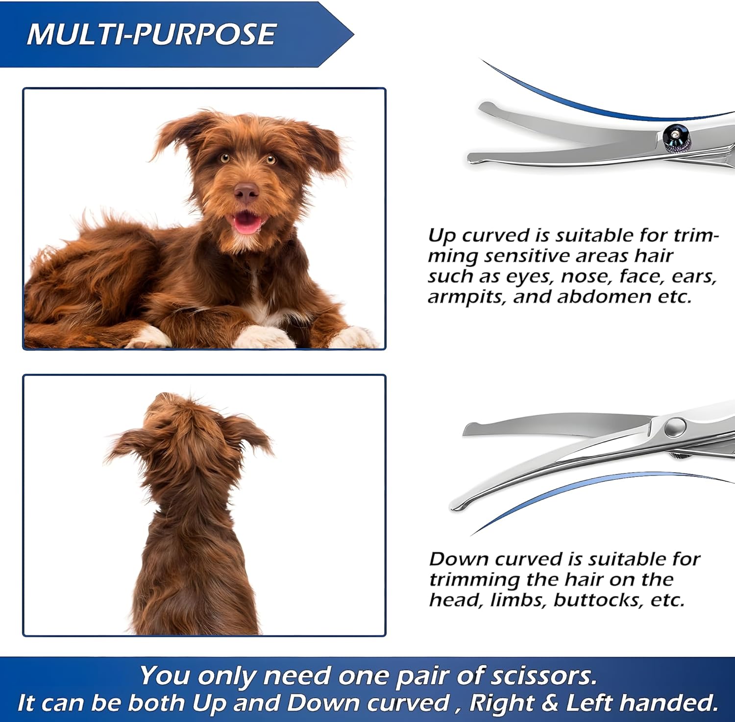 Both Curve Up & Curve Down Scissors – The curved dog grooming shears can be used upward or downward without having to change scissors. The curved up shears can trim the hairs around your pet’s eyes, ears, paws and make it looks more natural and beautiful. And the curved down scissors can make cute styles based on the shapes of your pet’s face and head.